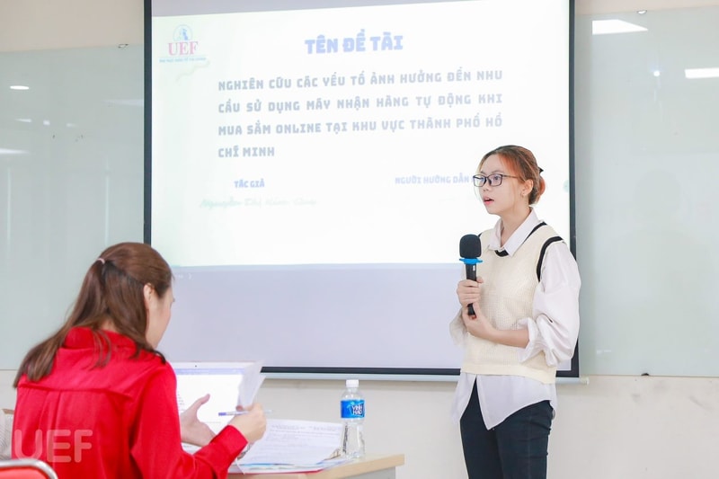 3 đề tài nghiên cứu được nghiệm thu trong ngày 31/3 gồm: (1) Các yếu tố ảnh hưởng đến nhu cầu lựa chọn nơi ở của sinh viên trường hợp nghiên cứu tại các trường đại học trên địa bàn TP.HCM của nhóm sinh viên Phan Viết Đức, Võ Thị Mỹ Anh, Trịnh Hoài Nam và Đoàn Ngọc Tú Uyên; (2) Phân tích các yếu tố tác động đến việc lãng phí thời gian của sinh viên các trường đại học trên địa bàn TP.HCM trong giai đoạn Covid-19 của nhóm sinh viên Tạ Lê Đăng Khoa, Lê Thị Phương Uyên, Trần Kim Ngân và Phạm Trần Minh Nhật; (3) Nghiên cứu các yếu tố ảnh hưởng đến nhu cầu sử dụng máy nhận hàng tự động khi mua sắm online tại khu vực TP.HCM của bạn Nguyễn Thị Kim Quy.