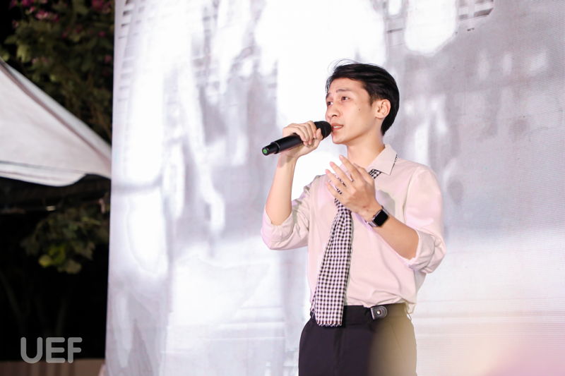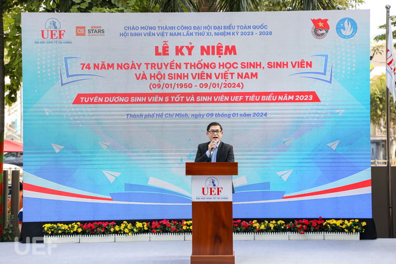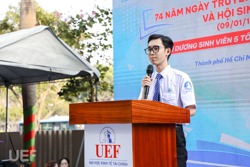 Đồng chí Trần Vĩnh Hoàng - Chủ tịch Hội Sinh viên UEF đã có phần mở đầu ôn lại truyền thống học sinh, sinh viên đầy vẻ vang trong 74 năm qua. Các thế hệ cha anh đi trước đã đóng góp và hi sinh cho công cuộc xây dựng bảo vệ Tổ quốc lẫn sự nghiệp giáo dục. Đặc biệt là sự hi sinh của đồng chí Trần Văn Ơn đã lan tỏa tinh thần yêu nước, vực dậy chống lại đàn áp của thế lực thù địch trong tầng lớp học sinh, sinh viên thời bấy giờ.