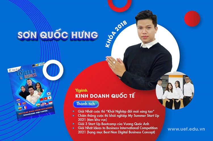 Cùng với Phương Thảo, trong mảng học thuật tại UEF 2021, cái tên Sơn Quốc Hưng nổi lên như 1 “hiện tượng”. Sau thành công của dự án túi xách làm từ phụ phẩm cà phê và mía với giải Nhất cuộc thi “Khởi nghiệp đổi mới sáng tạo”, anh bạn cùng đồng đội tiếp tục xuất sắc đại diện cho Nhà UEF và chiến thắng khi góp mặt ở Mini Contest “My Summer Startup - Wildcats” do Việt Nam kết hợp với Thái Lan tổ chức. Cũng với đề tài trên, Quốc Hưng cùng team ghi thêm dấu ấn giải 3 chung cuộc tại “Long Life Creative Bootcamp” - là cuộc thi khởi nghiệp được tổ chức bởi trường Đại học Bách Khoa Hà Nội phối hợp với trường đại học Bangor (Vương Quốc Anh), giải Nhất Ideas to Business International Competition 2021 ở hạng mục Best Non Digital Business Concept, Leader Dự án Kể chuyện sáng tạo của Trung tâm Kết nối cộng đồng,... Trong bối cảnh của năm học vừa qua, Sơn Quốc Hưng đã trở thành nhân vật truyền cảm hứng và động lực cho nhiều UEFers trong việc cọ xát cùng các cuộc thi.