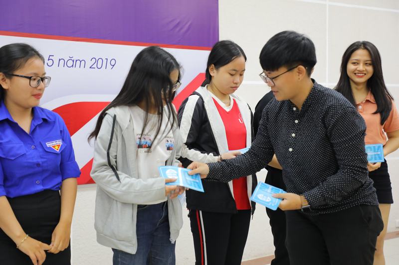 Anh Nguyễn Huỳnh Sinh – Bí thư Đoàn trường đại diện nhà tài trợ TP Bank trao quà cho các bạn sinh viên may mắn