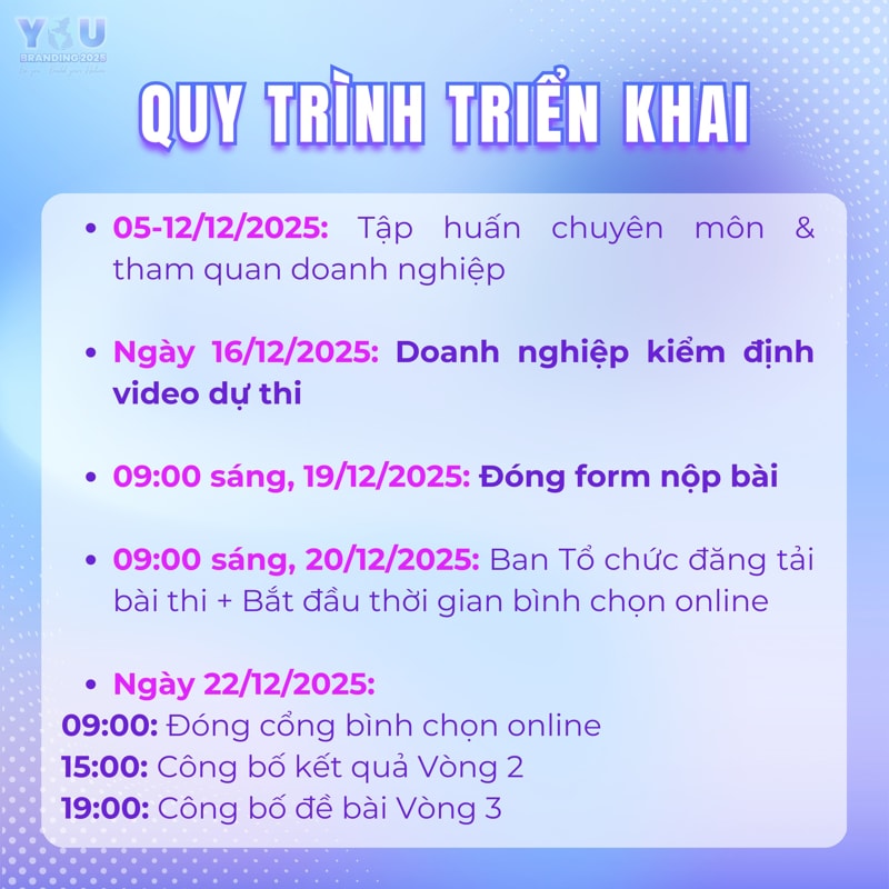 Trong khoảng thời gian từ 5 - 12/12, Top 40 sẽ được trải nghiệm môi trường doanh nghiệp thực tế, gặp gỡ lãnh đạo, lắng nghe câu chuyện thương hiệu và thu thập những chất liệu chân thật nhất cho bài thi. Sau đó, vào ngày 16/12, doanh nghiệp sẽ trực tiếp kiểm định video. Và hạn cuối nộp bài là ngày 19/12/2025.