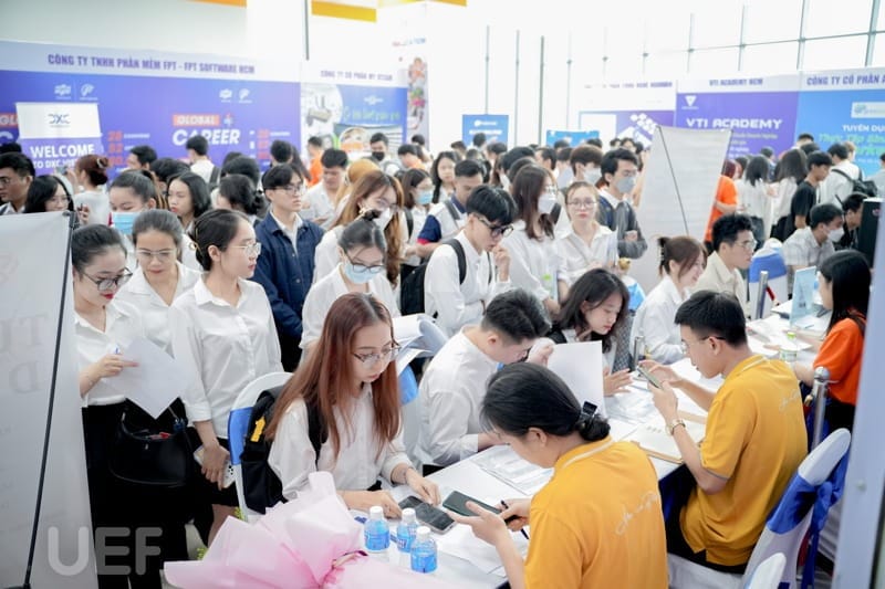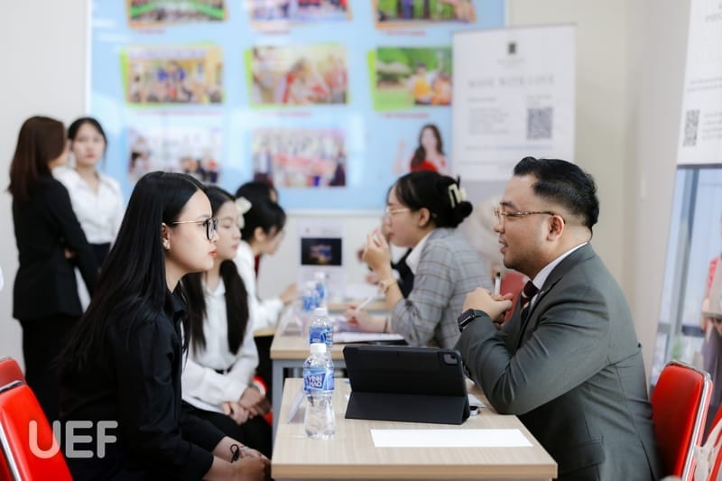 “Mock-Interview & Job Fair” là sự kiện thường niên của UEF, không chỉ dành riêng cho sinh viên năm 3 hay năm cuối đang chuẩn bị kỳ thực tập, mà còn mở rộng cho cơ hội cho sinh viên toàn trường tiếp cận sớm với doanh nghiệp, học hỏi kinh nghiệm phỏng vấn tuyển dụng, tìm kiếm việc làm. Tại đây, sinh viên sẽ trải nghiệm quy trình phỏng vấn thực tế, nâng cao sự tự tin và chuẩn bị hành trang sẵn sàng bước vào môi trường làm việc chuyên nghiệp.
