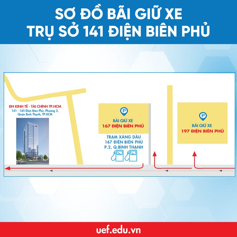 Với cơ sở 141 Điện Biên Phủ, sinh viên có thể tham khảo 2 bãi giữ xe tại địa chỉ sau: cây xăng (167 Điện Biên Phủ, cách UEF 150m), 197 Điện Biên Phủ.