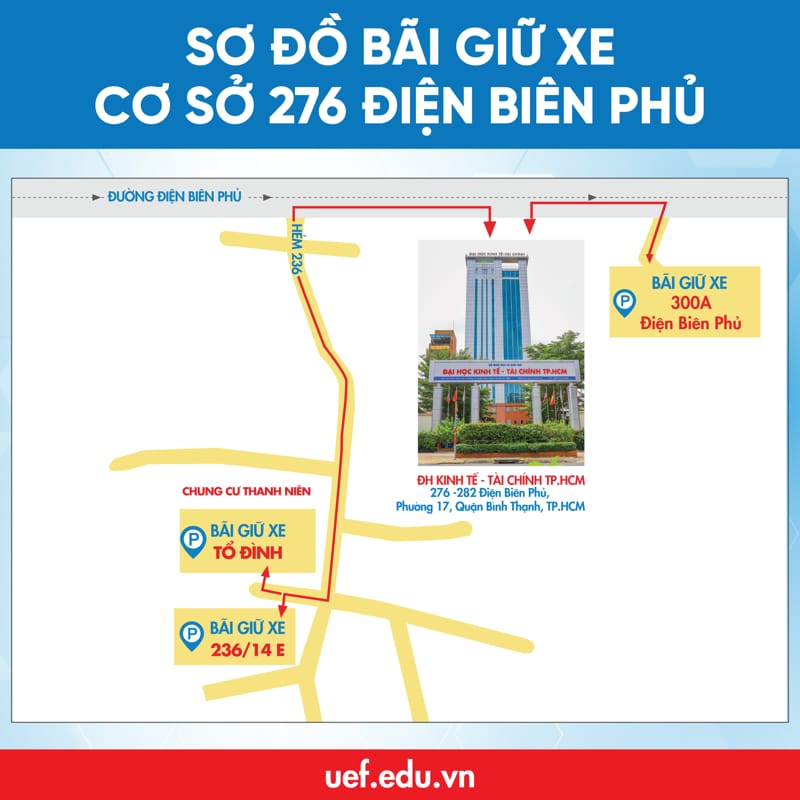 Trong những giờ cao điểm, bãi giữ xe là vấn đề luôn được các bạn sinh viên quan tâm. Ngoài khu vực tầng hầm gửi xe được bố trí tại hai cơ sở 141 và 276 của trường, UEFers có thể lựa chọn gửi xe ở các địa điểm lân cận. Việc lưu ý kỹ vấn đề này sẽ giúp các bạn thuận tiện hơn trong việc di chuyển, tránh tình trạng hoang mang khi đến trường vào ngày đầu tiên sau kỳ nghỉ dài.