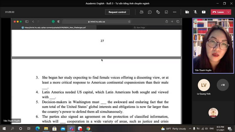 Sau hai buổi tư vấn về cách nghe - ghi chép tin trong Quan hệ quốc tế và nâng cao vốn từ vựng chuyên ngành Ngoại giao, hoạt động báo cáo chuyên đề hàng tuần của khoa Quan hệ quốc tế với chủ đề: “Tiếng Anh chuyên ngành cho sinh viên Quan hệ Quốc tế” tiếp tục được tổ chức vào tối ngày 1/7 vừa qua.