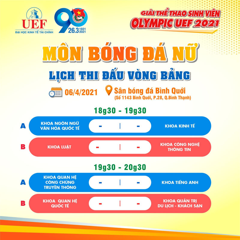 Những trận đấu đầu tiên sẽ diễn ra vào ngày 6/4, trong 2 khung giờ từ 18g30 - 19g30 và từ 19g30 - 20g30, tại sân bóng Bình Quới. Trong ngày tranh tài đầu tiên, ở bảng A, khoa Ngôn ngữ và văn hóa quốc tế sẽ đối đầu khoa Kinh tế, khoa Quan hệ công chúng và truyền thông so tài với khoa Tiếng Anh.