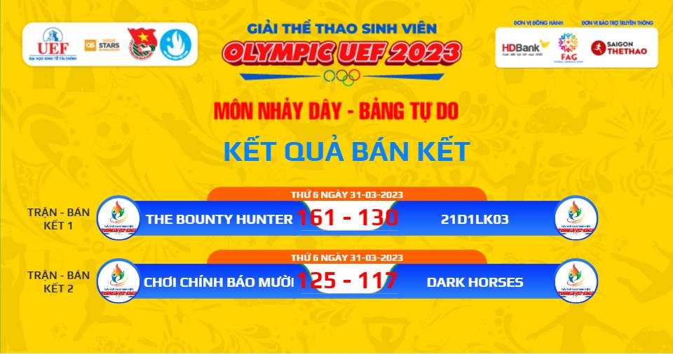 Với bộ môn Nhảy dây đòi hỏi sự kết hợp khéo léo, các đội chơi đã mang đến những màn thể hiện hấp dẫn cùng độ tập trung cao. 2 cặp đấu vòng Bán kết là The Bounty Hunter – 21D1LK03, Chơi chính báo mười – Dark Horses.