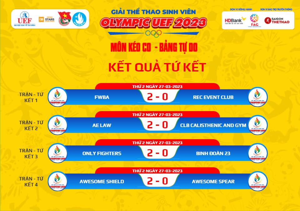 4 cặp đấu tranh tài ở vòng Tứ kết gồm: FwBA – REC Event Club, AE Law – CLB Calisthenic and Gym, Only Fighters – Binh đoàn 23, Awesome Shield – Awesome Spear.