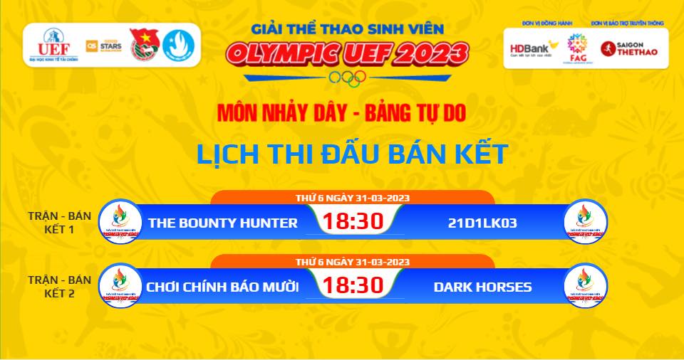 Cùng thời gian với bộ môn kéo co, bộ môn nhảy dây bảng tự do cũng sẽ diễn ra các trận Bán kết vào tối 31/3. Hai cặp đấu gồm: The Bounty Hunter – 21D1LK03, Chơi chín báo mười – Dark Horses.