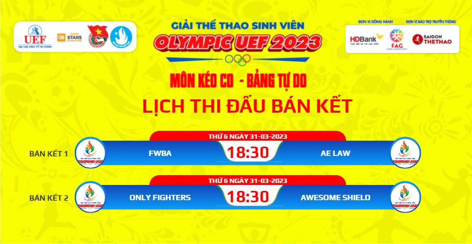 Vòng Bán kết sẽ diễn ra vào lúc 18g30 ngày 31/3 với thứ tự thi đấu: FwBA – AE Law, Only Fighters – Awesome Shield.