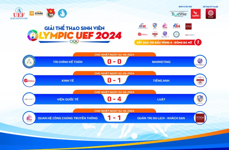 Ở nội dung nữ, các cặp đấu gồm: Khoa Tài chính - Kế toán với Khoa Marketing, Khoa Kinh tế với Khoa Tiếng Anh, Viện Quốc tế với Khoa Luật, Khoa Quan hệ công chúng và Truyền thông với Khoa Quản trị du lịch - Khách sạn.