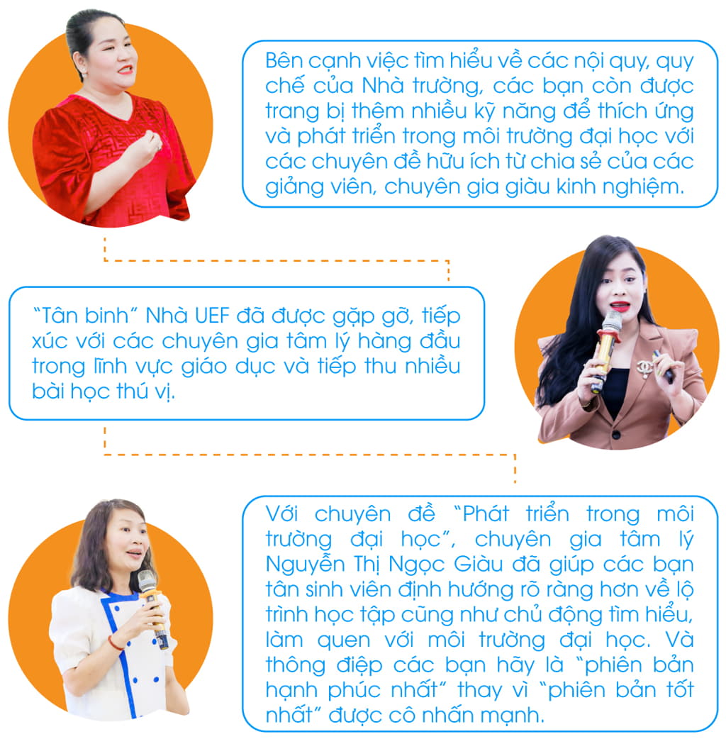 Trong những ngày đầu của tuần lễ sinh hoạt đầu khóa, tân sinh viên đã được cập nhật những thông tin liên quan đến quy chế học vụ như quy chế tín chỉ, chương trình đào tạo; tổ chức đào tạo về thời gian, kế hoạch, đánh giá kết quả học tập, xét và công nhận tốt nghiệp; các cổng thông tin UEF; chính sách học phí - học bổng; trung tâm hỗ trợ học vụ; chương trình song bằng - song ngành,… Dịp này các bạn cũng được làm quen và tiếp xúc trực tiếp với đại diện các phòng ban như Phòng đào tạo, Phòng công tác sinh viên, Trung tâm Tin học – Ngoại ngữ,…