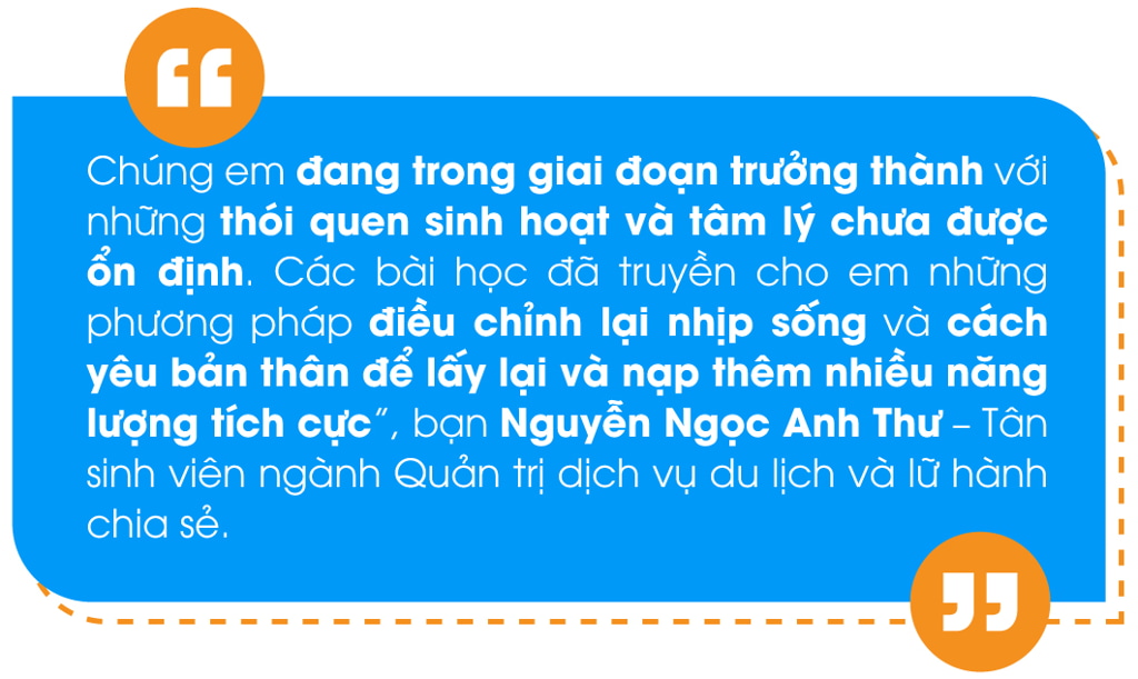 ![]() Bên cạnh các bài học tâm lý, các bạn được lắng nghe nhiều kỹ năng cần thiết để hòa nhập vào môi trường mới từ kinh nghiệm thực tiễn của TS. Trần Thanh Huyền – Trưởng khoa Quan hệ quốc tế, TS. Đào Minh Hồng – Phó Trưởng khoa Quan hệ quốc tế hay TS. Nguyễn Hữu Long – Giảng viên Đại học Mở TP.HCM đã chia sẻ. Ở môi trường đại học, các bạn cần xác định được nhu cầu và mục đích cá nhân. Điều quan trọng để bản thân tốt hơn và thành công là nhận ra sự phù hợp và biết cách tương thích cá nhân với môi trường xung quanh cũng như hành động với 3 từ khóa: tư duy mở”, “thái độ tôn trọng”, “hành xử văn minh”. ![]() ![]()