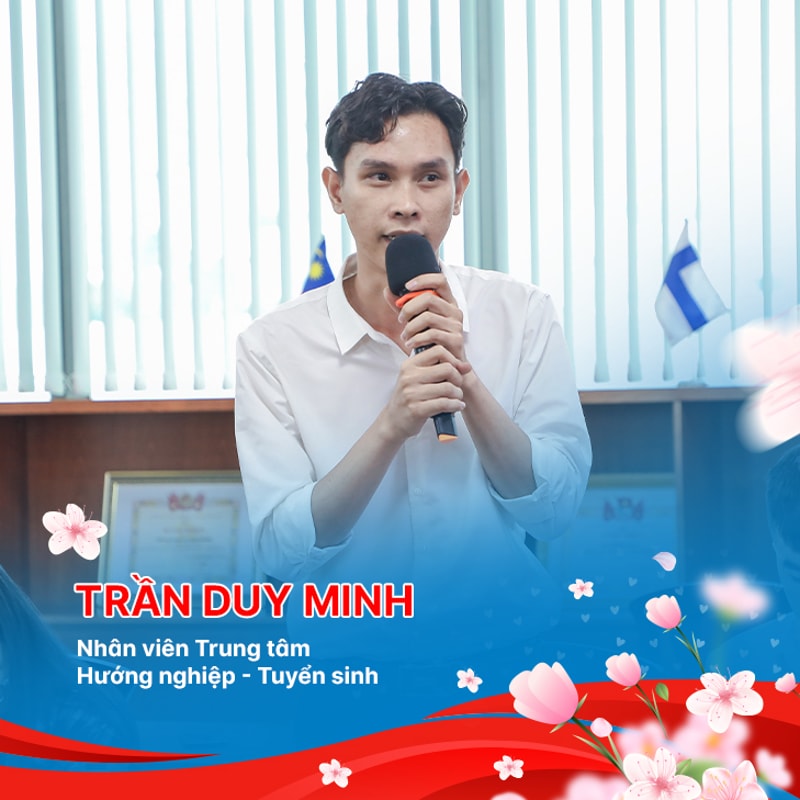 "Tôi xin gửi lời chúc mừng tốt đẹp nhất đến những người phụ nữ trong cuộc sống của mình, những người đã luôn đồng hành và truyền cảm hứng cho tôi. Họ luôn là nguồn động viên, sự ủng hộ vững chắc và tình yêu thương vô điều kiện. Những khó khăn và thách thức không bao giờ làm mất đi sự kiên nhẫn và sức mạnh của họ. Tôi mong rằng họ sẽ luôn được hạnh phúc, thành công và tỏa sáng trong mọi khía cạnh cuộc sống" - anh Trần Minh Duy - Nhân viên Trung tâm Hướng nghiệp - Tuyển sinh bộc bạch.