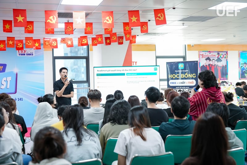 Thấu hiểu những khó khăn thường gặp trong quá trình tiếp cận ngoại ngữ, sáng ngày 21/4, chuỗi chương trình UEF By Your Sides tiếp tục tổ chức buổi workshop với chủ đề “Read Smart – Speak Fast”. Chương trình mang đến những định hướng thiết thực nhằm nâng cao kỹ năng đọc hiểu và cải thiện khả năng phản xạ giao tiếp tiếng Anh cho sinh viên.