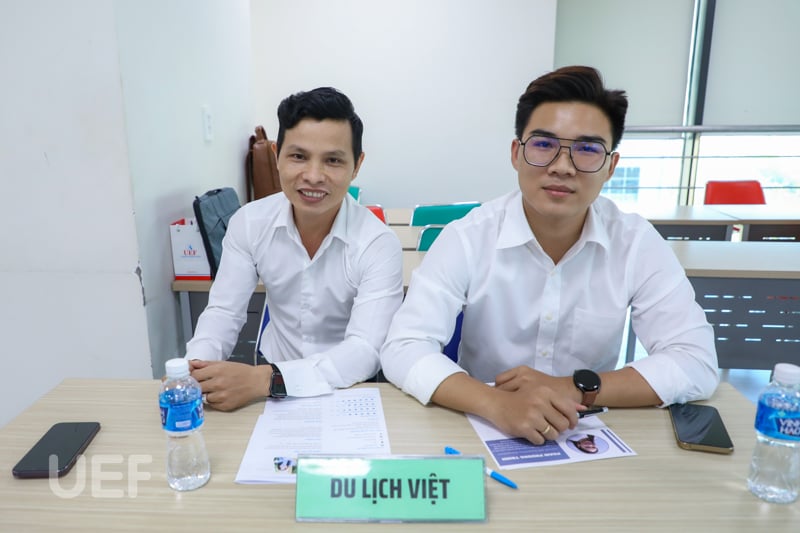Ông Nguyễn Bữu Lâm (bên trái) - Đại diện Công ty Du lịch Việt đánh giá cao khả năng ngoại ngữ của sinh viên UEF