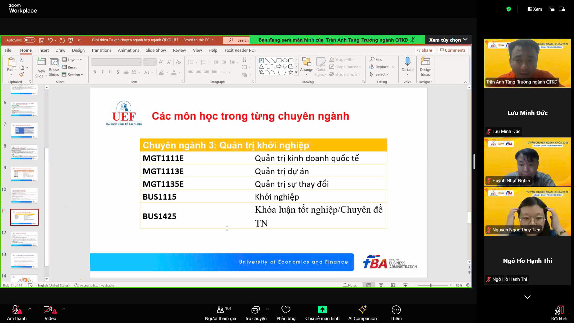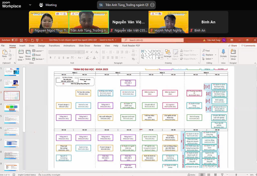 Chương trình có sự tham gia chia sẻ của TS. Huỳnh Nhựt Nghĩa – Phó Trưởng khoa, ThS. Nguyễn Ngọc Thủy Tiên – Phó Trưởng khoa và ThS. Trần Anh Tùng – Trưởng ngành Quản trị kinh doanh. Các thầy cô đã lần lượt giới thiệu tổng quan các chuyên ngành học, mục tiêu đào tạo, sự khác biệt giữa các chuyên ngành và cơ hội nghề nghiệp trong từng lĩnh vực.