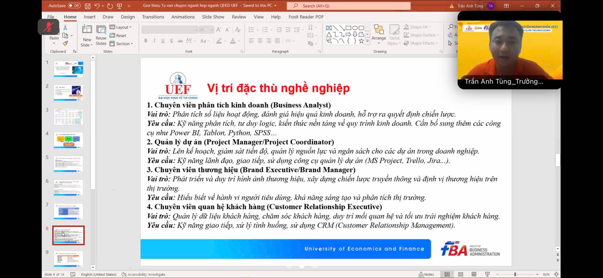 Thông qua phần trình bày chi tiết và thực tế từ các thầy cô, sinh viên có cái nhìn rõ ràng hơn về lộ trình học tập và nghề nghiệp. Một số vị trí công việc tiêu biểu sau khi tốt nghiệp mà sinh viên có thể hướng đến: Chuyên viên phân tích kinh doanh, quản lý dự án, chuyên viên thương hiệu, chuyên viên nhân sự, chuyên viên dịch vụ khách hàng,... Nhà sáng lập, chuyên viên phát triển kinh doanh, điều phối dự án, chuyên viên đổi mới sáng tạo,...