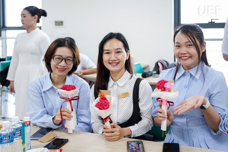 Bên cạnh những lời chúc ý nghĩa, sinh viên Khoa Kinh tế cũng chuẩn bị những món quà handmade từ workshop “Bloom of Gratitude - Hoa nở lòng tri ân” để dành tặng thầy cô. Những bó hoa và tấm thiệp do chính tay các bạn làm ra tuy giản dị nhưng chứa đựng nhiều tình cảm, thể hiện sự trân quý dành cho những người đã tận tâm đồng hành với mình. Đại diện Đoàn - Hội Khoa Kinh tế cũng gửi tặng thầy cô món quà tri ân đặc biệt, thay lời cảm ơn vì sự hỗ trợ và định hướng mà các thầy cô đã dành cho sinh viên trong quá trình tổ chức các hoạt động tập thể.