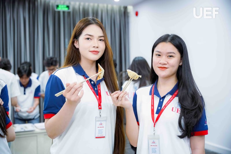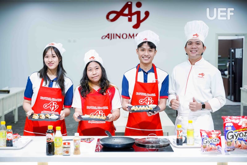 Không chỉ dừng lại ở việc lắng nghe và tham quan, sinh viên Khoa Marketing còn có cơ hội trải nghiệm những hoạt động khác vô cùng hấp dẫn và thú vị tại nhà máy Ajinomoto Việt Nam. Dưới sự hướng dẫn tận tình của đầu bếp Ajinomoto, các bạn đã trực tiếp nấu ăn và thử vị với món bánh xếp kiểu Nhật Gyoza, cơm cuộn chấm sốt mè rang "Aji-xốt" cùng trà vải hoa hồng Blendy.