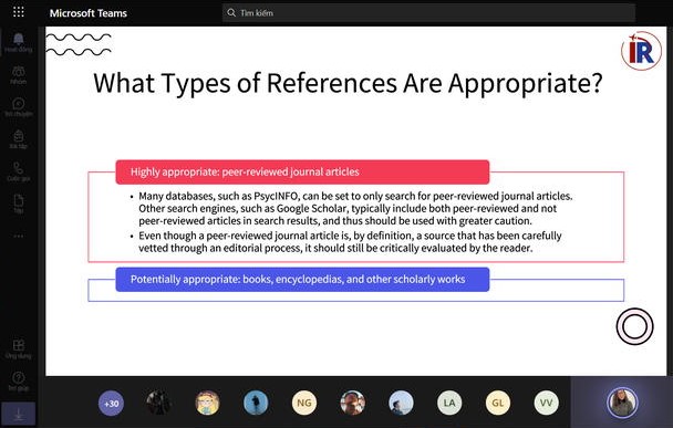 Mở đầu buổi chia sẻ, cô Huyền đã nêu bật tầm quan trọng của thông tin, tư liệu trong quá trình nghiên cứu: “Mặc dù quá trình nghiên cứu sẽ có nhiều giai đoạn khác nhau nhưng bất kỳ giai đoạn cũng cần tìm kiếm thông tin”.
