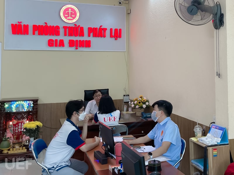Trước khi kết thúc chuyến, UEFers đã được tạo điều kiện để xem các vi bằng thực tế được ghi nhận tại sự kiện, cuộc họp, giao nhận,... Ngoài ra, các bạn còn đóng vai khách hàng, suy nghĩ ra các vấn đề để được nhân viên Văn phòng Thừa phát lại Gia Định tư vấn. Với những chia sẻ từ chuyên gia, các bạn đã có thêm nền tảng kiến thức mới về một lĩnh vực trong nghề nghiệp, mở rộng cơ hội tiếp cận các công việc sau này. Qua đó cũng trang bị và rèn luyện thêm các yếu tố cần thiết nếu có định hướng theo con đường Thừa phát lại.