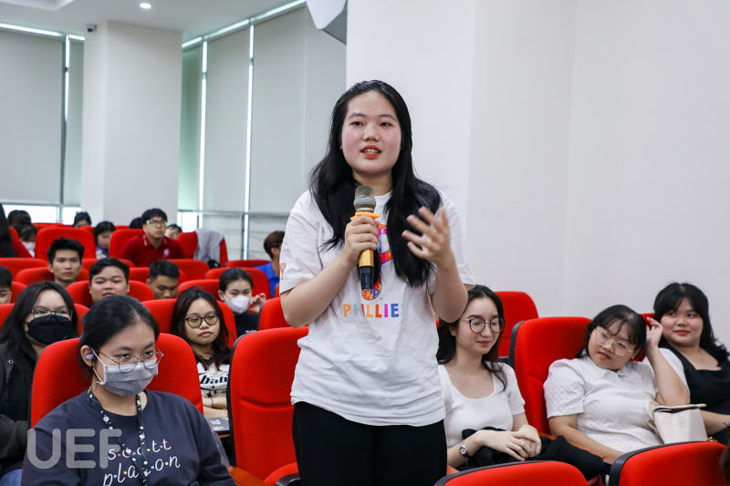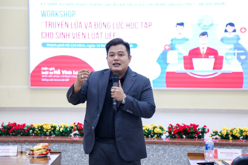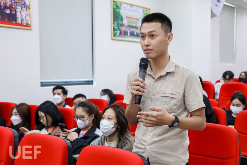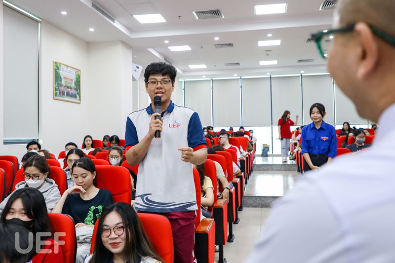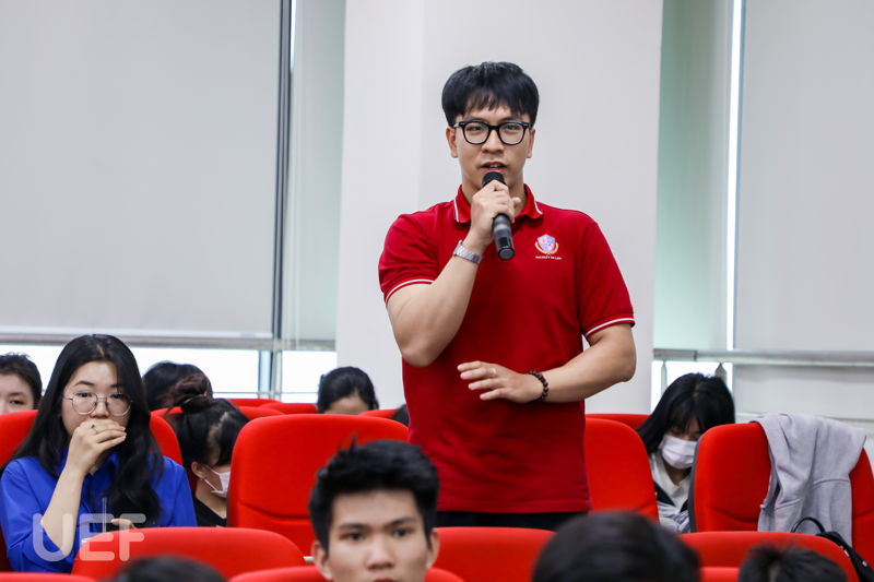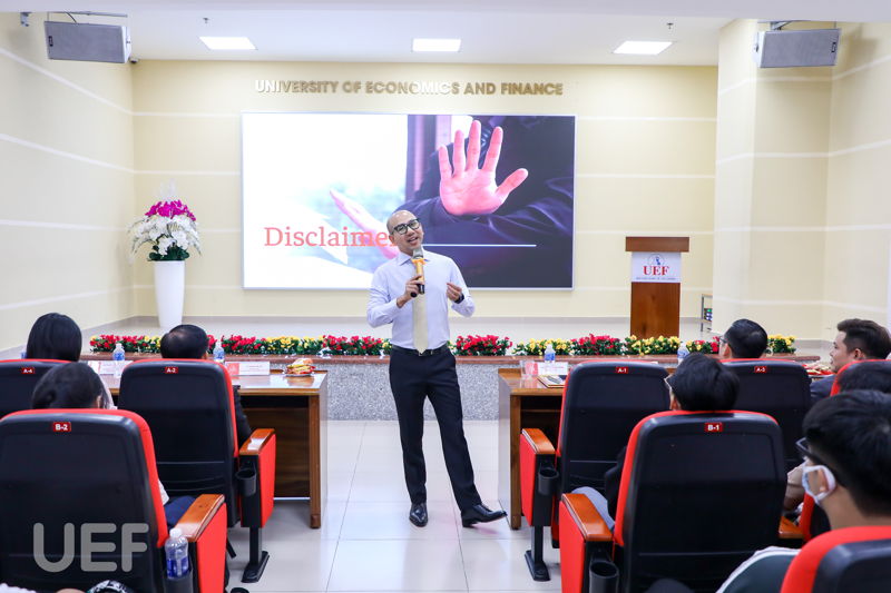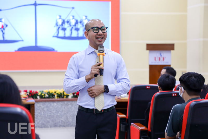 Tiếp nối chia sẻ của diễn giả, khách mời ThS. Hồ Anh Phụng cũng gửi gắm đến toàn thể sinh viên nguồn động lực từ người đi trước. Hiện tại, anh đang hoạt động trong lĩnh vực kinh doanh và nhận thấy ngành Luật đã học bổ trợ cho anh rất nhiều. Theo khách mời, sinh viên UEF cứ mạnh dạn theo đuổi đam mê của mình, rồi cuộc đời sẽ cho các bạn hai chữ thành công. Hãy tự biến áp lực thành động lực để cố gắng hơn mỗi ngày.