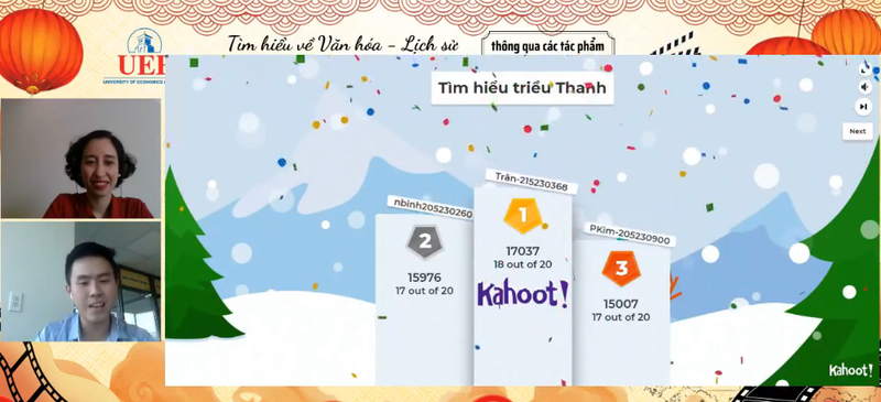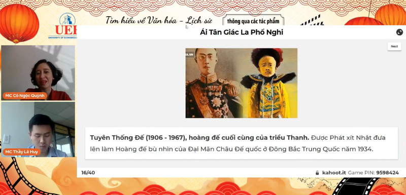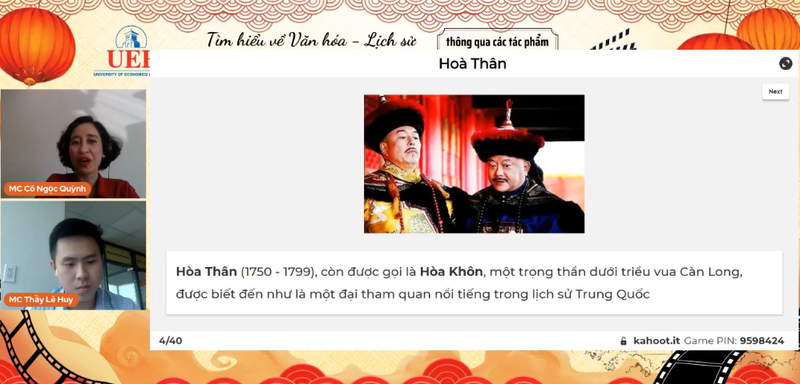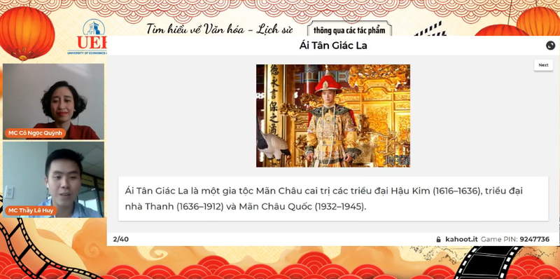 Thông qua video clip giới thiệu lịch sử, văn hóa nhà Thanh và 20 câu hỏi trên Kahoot!, các bạn sinh viên đã hiểu hơn về triều đại này. Nhà Thanh là một triều đại do dòng họ Ái Tân Giác La ở Mãn Châu thành lập, tồn tại 276 năm (từ năm 1616 - 1912), trải qua 12 đời vua.