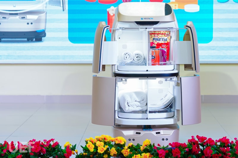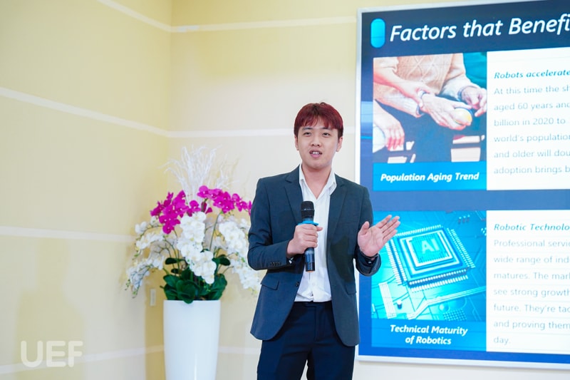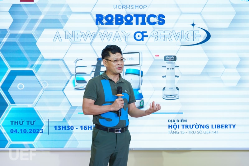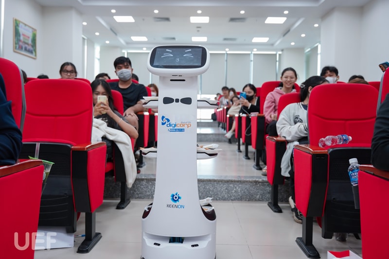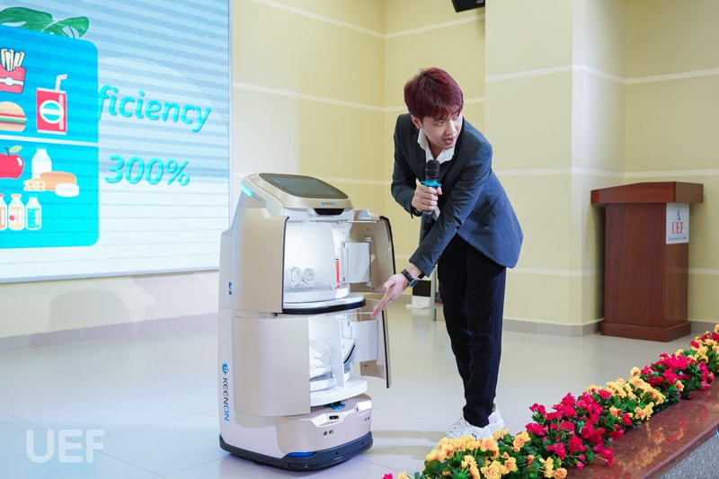 Tại chương trình, anh đã phân tích kỹ lưỡng về các thế mạnh của robot trong ngành dịch vụ như: tăng cường hiệu quả, giảm chi phí, nâng cao trải nghiệm khách hàng,… cho các bạn UEFers được tận mắt chứng kiến cách robot vận hành.