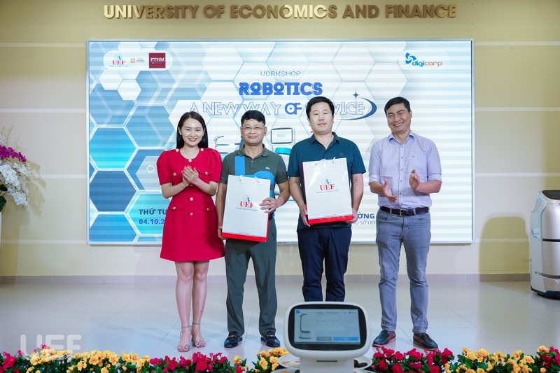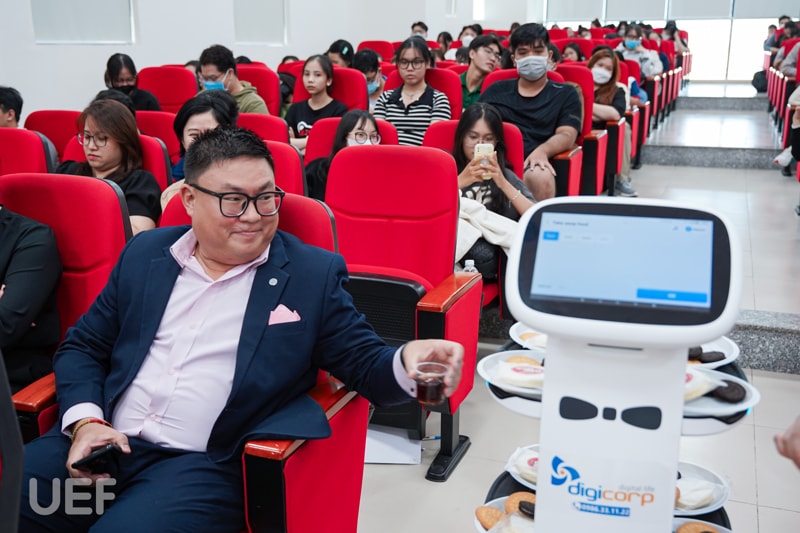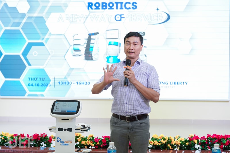 Tiếp lời, ông Trần Văn Nam - Chủ tịch Hội đồng quản trị - Công ty Cổ phần Digicorp đã chia sẻ với các bạn sinh viên, giúp UEFers phần nào hiểu hơn về xu hướng công nghệ Robot trong ngành Nhà hàng – Khách sạn và định hướng, cập nhật công nghệ mới để đón đầu các xu thế.