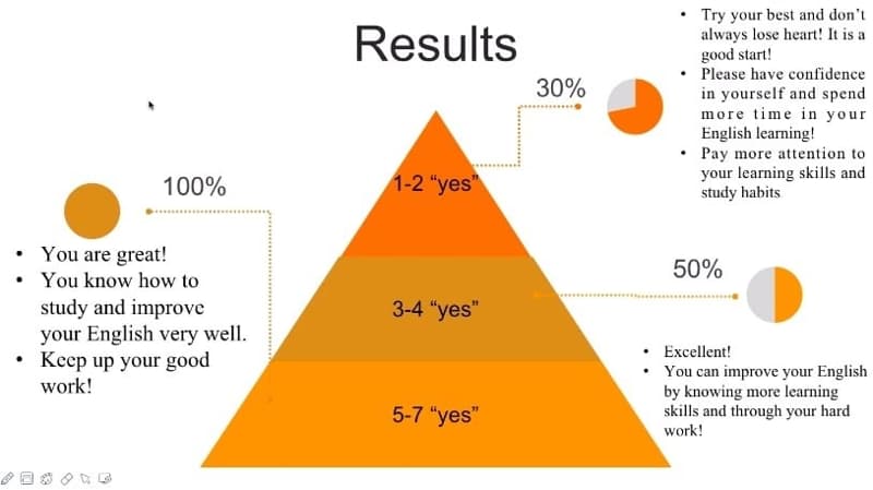 Diễn giả cũng đưa ra đánh giá theo tỷ lệ “Yes" của từng câu hỏi, nếu trả lời có từ câu 1-2, các bạn chỉ đạt 30%, vì vậy phải nỗ lực nhiều hơn, tự tin vào bản thân, dành nhiều thời gian hơn để học tiếng Anh, để tâm đến các kỹ năng học tiếng Anh và thiết lập thói quen học tập.