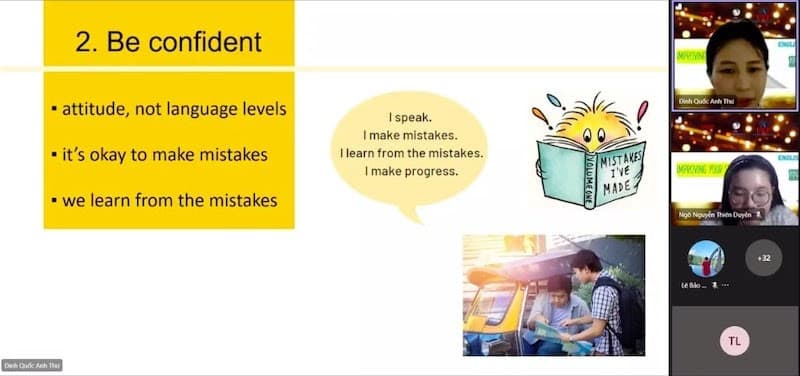 Mở đầu phần chia sẻ, ThS. Ngô Nguyễn Thiên Duyên đã giúp sinh viên nhận thức về kỹ năng nói tiếng Anh của bản thân đang ở đâu với 7 câu hỏi “Yes or No": (1) Bạn có một kế hoạch những hoạt động để nâng cao kỹ năng nói?, (2) Bạn có học từ vựng mới thông qua ngữ cảnh?, (3) Bạn có tham gia câu lạc bộ về giao tiếp, hội thoại tiếng Anh?, (4) Bạn có cố gắng nói tiếng Anh thường xuyên nhất có thể?, (5) Bạn có nói tiếng Anh bên ngoài lớp học?, (6) Bạn có thường xuyên học từ vựng mới?, (7) Bạn có tự nói chuyện với bản thân bằng tiếng Anh?