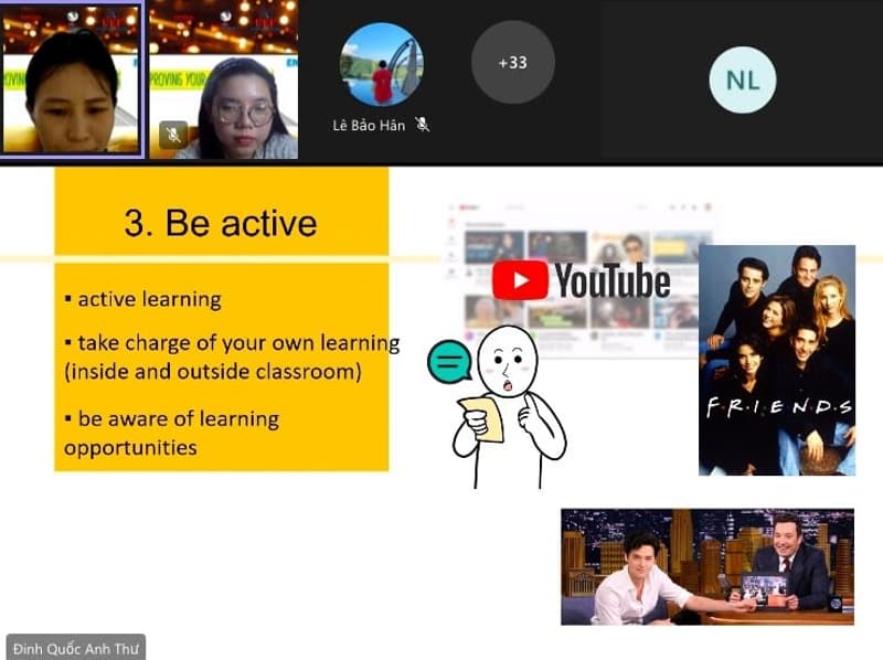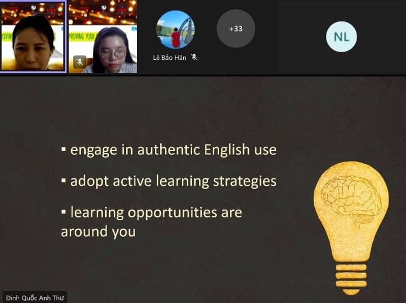 Theo đó, cô Thư đã hướng dẫn các bạn cách giải quyết thích hợp cho từng vấn đề, điều quan trọng hơn hết khi học giao tiếp tiếng Anh là các bạn phải tự tin, tích cực và thật sự yêu thích. Từ đó, tìm ra những phương pháp học hiệu quả như học cùng bạn bè, học qua âm nhạc, video, phim ảnh, thực hành nhiều hơn, tận dụng mọi cơ hội học tập không chỉ ở trong lớp học,...