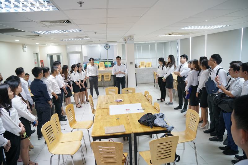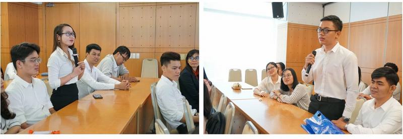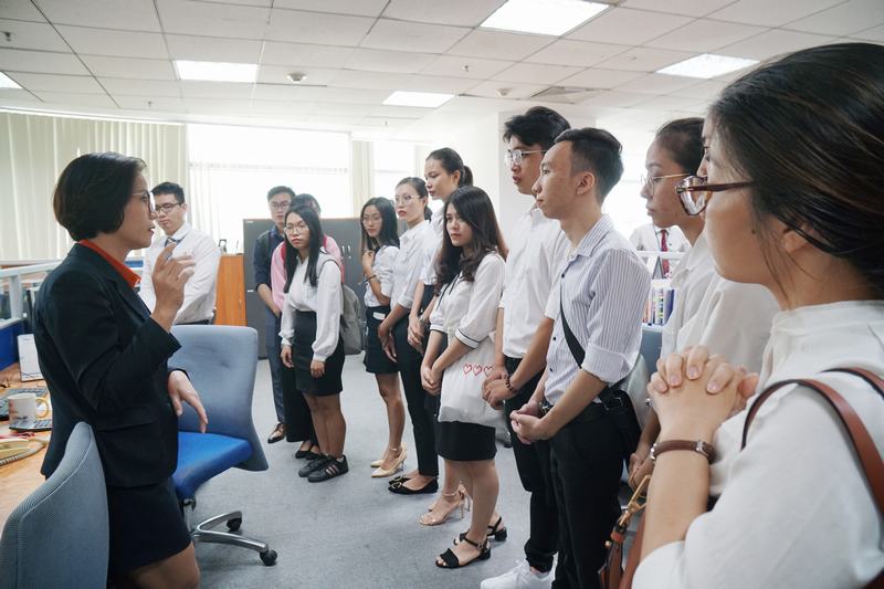 Ngay sau phần chia sẻ thông tin, các bạn sinh viên được đại diện ngân hàng hướng dẫn tham quan môi trường làm việc thực tế của từng bộ phận, phòng ban, đặc biệt là tìm hiểu quy trình làm việc của phòng Pháp chế và phòng Quản trị rủi ro.