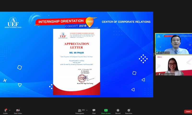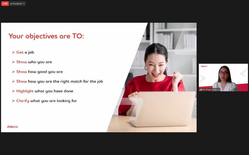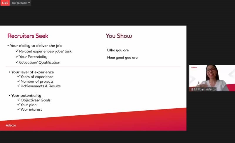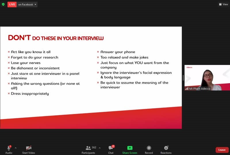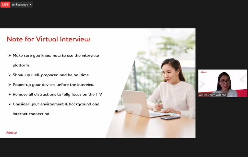 Trong bối cảnh “bình thường mới”, những cuộc phỏng vấn tuyển dụng cũng có thể chuyển đổi sang hình thức trực tuyến. Vì thế, chị Mi Phạm cũng chia sẻ các “tips” để sinh viên có cuộc phỏng vấn trực tuyến tốt như: đường truyền internet, kỹ thuật, tạp âm, môi trường, background,…