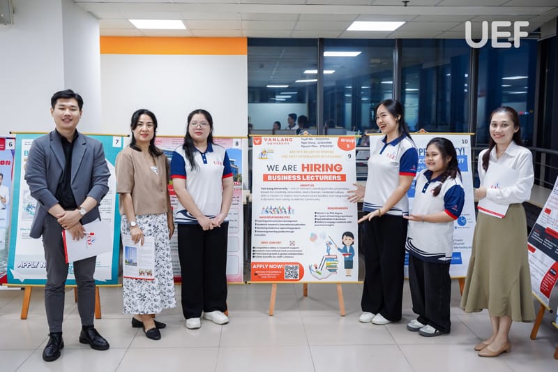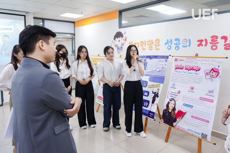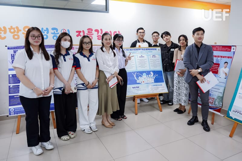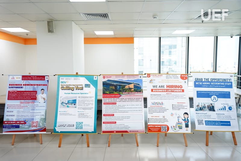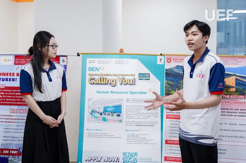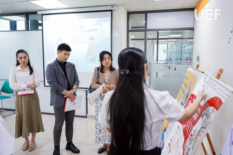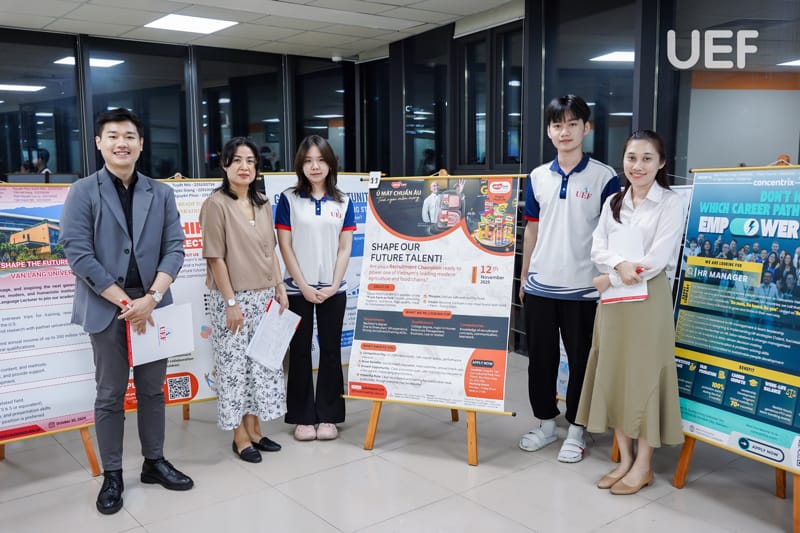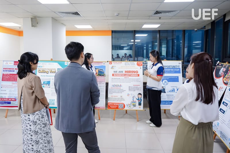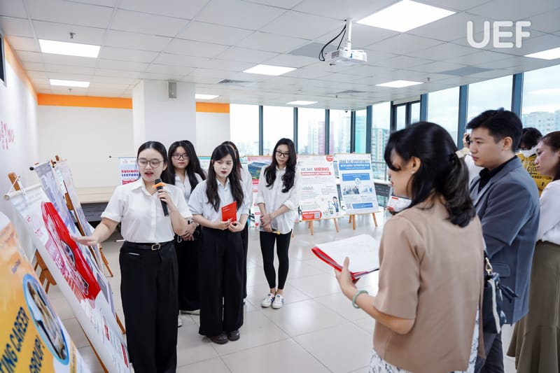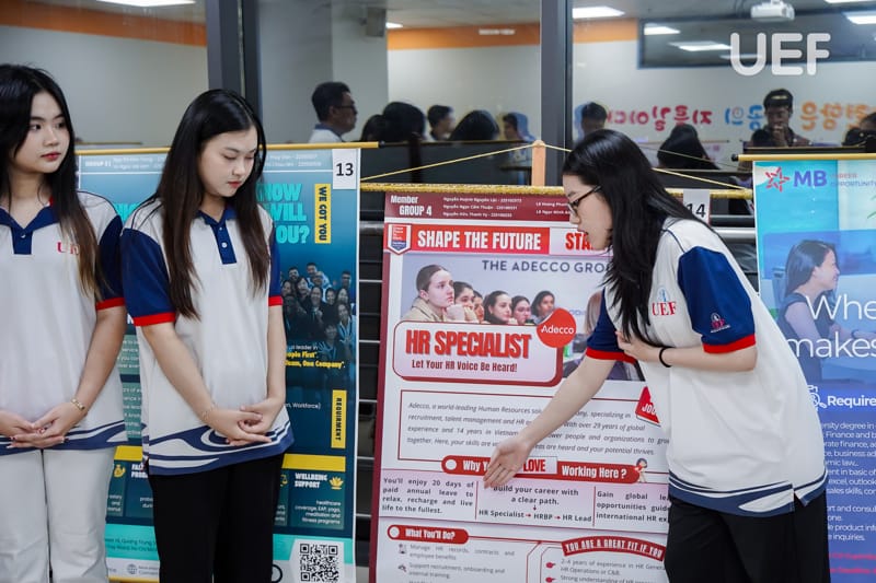 Bên cạnh phần chia sẻ, chương trình còn là dịp để sinh viên thể hiện kết quả học tập thông qua 15 đề tài dự án nhóm, được trình bày dưới dạng poster, với các chủ đề thực tế về tuyển dụng, kế toán, đào tạo - phát triển nhân sự, quản trị kinh doanh,…