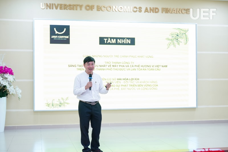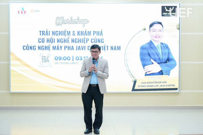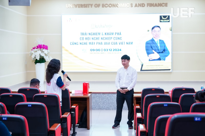 Chương trình có sự đồng hành của ông Nguyễn Bá Hải - Đồng sáng lập JAVI Coffee. Diễn giả đã mang đến những câu chuyện khởi nghiệp đầy cảm hứng, đồng thời, giới thiệu đến sinh viên UEF các cơ hội làm việc bán thời gian bao gồm các vị trí như nhân viên phục vụ, bán hàng, tiếp thị bán hàng,... đặc biệt là cơ hội khởi nghiệp với mô hình xe cà phê độc đáo. Đây không chỉ là cơ hội để các bạn trải nghiệm thực tế, tích lũy kinh nghiệm mà còn là bước đệm để khám phá tiềm năng bản thân trong môi trường kinh doanh hiện đại.