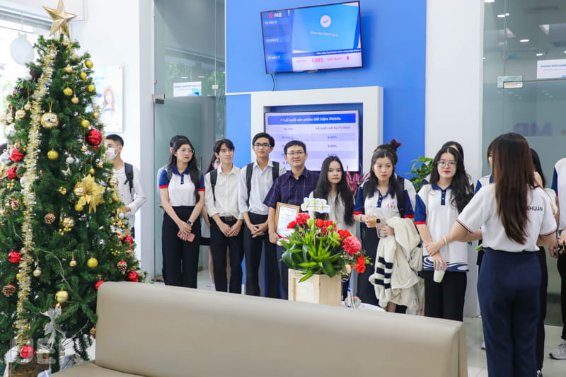 Tại đây, các bạn sinh viên được tham quan khu vực sảnh ngân hàng MB Bank, tìm hiểu các vị trí chăm sóc khách hàng về vấn đề như vay vốn, mở thẻ, gửi sổ tiết kiệm,... với sự hướng dẫn của chị Quỳnh Như - Chuyên viên Ngân hàng MB Bank chi nhánh Phú Nhuận.