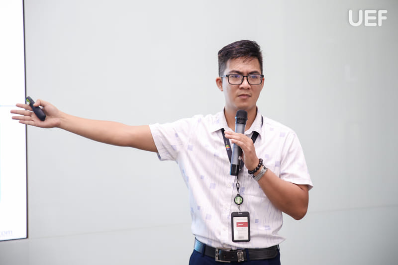 Tiếp đến, buổi Mini Workshop diễn ra với diễn giả chính là anh Trần Ngọc Tuấn đến từ FPT Software. Trong không khí vui vẻ và cởi mở, anh Ngọc Tuấn đã chia sẻ những thông tin giá trị về FPT Software: "Văn hóa của FPT Software là hiểu khách hàng, quan tâm đến khách hàng". Đây là định hướng mọi hoạt động và quyết định của công ty. Sinh viên UEF đã được giới thiệu về 2 mảng chính của FPT Software là dịch vụ và sản phẩm, cùng với hệ sinh thái đa dạng của tập đoàn. Từ phát triển phần mềm, tư vấn công nghệ đến các giải pháp chuyển đổi số toàn diện, FPT Software đã khẳng định vị thế tiên phong trong nhiều lĩnh vực.