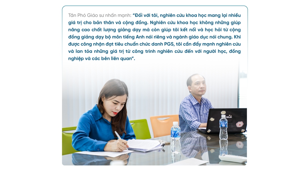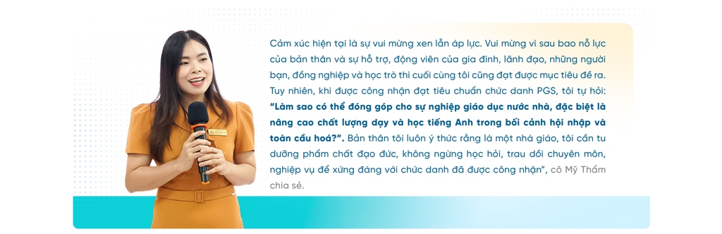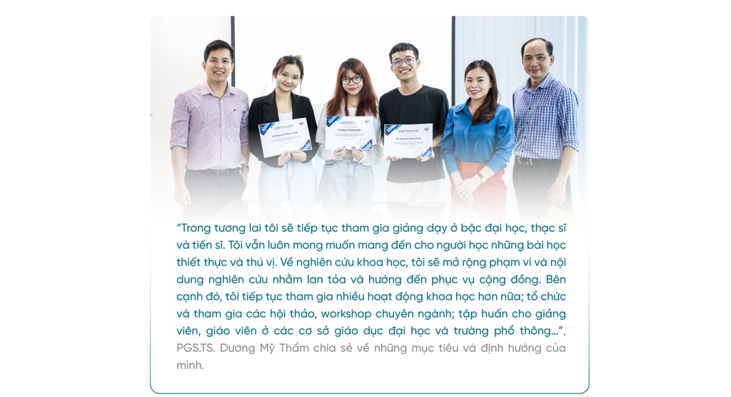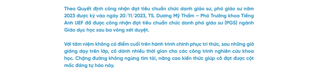 | .jpg) .jpg) Để được công nhận đạt tiêu chuẩn chức danh PGS, cô phải trải qua nhiều vòng xét. Đây là hành trình khá dài và nhiều cảm xúc. .jpg)  Theo quy trình xét công nhận đạt tiêu chuẩn chức danh PGS, các ứng viên cần đảm bảo ba yếu tố chính: đào tạo, nghiên cứu khoa học và đóng góp khác. Trong đó, các công trình nghiên cứu khoa học đóng vai trò rất quan trọng và nữ phó giáo sư cũng khẳng định việc tham gia tích cực phong trào nghiên cứu khoa học giúp cô tự tin hơn khi nộp hồ sơ xét duyệt. .jpg) .jpg) .jpg) Chia sẻ về khó khăn trên hành trình này, PGS.TS. Dương Mỹ Thẩm nhắc đến câu nói của Nhà thơ Jean de La Fontaine: “There is no road of flowers leading to glory” (Tạm dịch: Không có con đường nào dẫn đến vinh quang lại trải đầy hoa). Đối với cô, khó khăn lớn nhất có lẽ là làm thế nào để cân bằng cuộc sống. Với nhiều vai trò từ vị trí Phó Trưởng khoa, khoa Tiếng Anh đến người vợ, người mẹ trong gia đình, bên cạnh thời gian và công sức để chuẩn bị, hoàn thiện hồ sơ xét chức danh PGS, cô Thẩm phải đảm bảo không ảnh hưởng đến công việc chung cũng như cuộc sống. “Rất may mắn là tôi được sự hỗ trợ, động viên từ các cấp lãnh đạo nên bản thân đã hoàn thành tốt công tác chuyên môn của mình. Với vai trò người vợ, người mẹ, tôi cần vun vén cho gia đình và nuôi dạy con để không làm ảnh hưởng đến sự phát triển của con. Nhờ vào sự thông cảm của gia đình, sự hiểu chuyện của con gái, tôi đã vượt qua khó khăn này dễ dàng hơn tôi nghĩ”, cô Thẩm bày tỏ. .jpg) Để đi con đường không bằng phẳng, mỗi người đều có nguồn cảm hứng và động lực phía sau. Bên cạnh bản tính thích tìm tòi, nghiên cứu điều mới mẻ, nguồn cảm hứng lớn nhất của cô Thẩm là gia đình. Nữ phó giáo sư tâm tình: “Ba tôi đóng vai trò rất quan trọng trong cuộc sống và sự nghiệp của tôi. Ông không chỉ là người ba hết mực yêu thương con mà còn là người khai sáng và đặt nền móng cho con đường tri thức của tôi. Vì vậy, khi tôi đạt bất cứ thành tựu gì trong công việc, tôi đều muốn “khoe” với ông để được thấy ông cười hạnh phúc. Mẹ tôi cũng từng là giáo viên nên bà luôn ủng hộ, khuyến khích tôi nâng cao chuyên môn, nghiệp vụ. Một người cũng có ý nghĩa rất lớn trong cuộc sống và sự nghiệp của tôi là chồng tôi. Tôi gọi anh và tôi là “đôi bạn cùng tiến”. Chúng tôi công tác trong cùng một lĩnh vực nên luôn đồng hành và hỗ trợ lẫn nhau trong các hoạt động”. .jpg) “Học, học nữa, học mãi”, câu nói này là phương châm của PGS.TS. Dương Mỹ Thẩm để luôn làm mới và hoàn thiện bản thân từng ngày. Bên cạnh đó, bốn trụ cột của giáo dục do Ủy ban Văn hóa, Khoa học và Giáo dục của Liên hiệp quốc (UNESCO) chỉ ra: Học để biết - Học để làm - Học để chung sống - Học để khẳng định là nền tảng để cô trau dồi kiến thức, rèn luyện kỹ năng nhiều hơn để thích ứng với sự thay đổi không ngừng của thế giới xung quanh. Sau khi được công nhận đạt tiêu chuẩn chức danh PGS, cô Thẩm cũng đặt ra mục tiêu là duy trì, phát triển bản thân và đóng góp cho cộng đồng, cũng như đảm bảo tốt hơn về công tác giảng dạy, nghiên cứu khoa học và đóng góp khác. .jpg) .jpg) .jpg) |