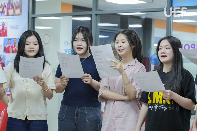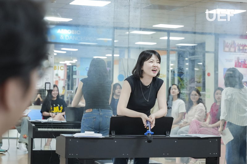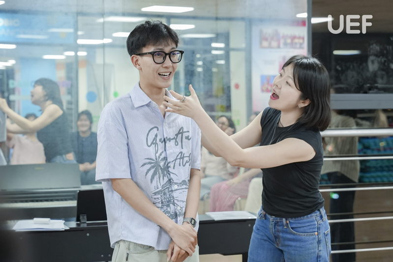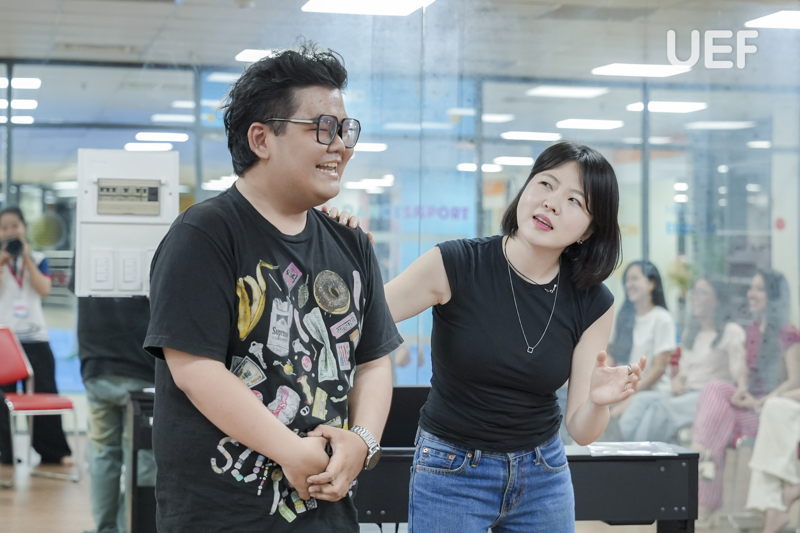 Phần thực hành với ca khúc “Arirang” (phiên bản biểu diễn hiện đại) mang đến trải nghiệm trực tiếp cho UEFers. Dưới sự hướng dẫn của diễn giả, các bạn luyện tập cách phát âm, lấy hơi và giữ nhịp giọng trong từng câu hát. Bên cạnh đó, việc kết hợp giữa giọng hát và chuyển động hình thể cũng được đề cập như một yêu cầu tất yếu trong biểu diễn đương đại. Qua đó, sinh viên có thêm góc nhìn thực tế về việc xây dựng phong cách trình diễn toàn diện, thay vì chỉ tập trung vào kỹ thuật thanh nhạc đơn lẻ.
