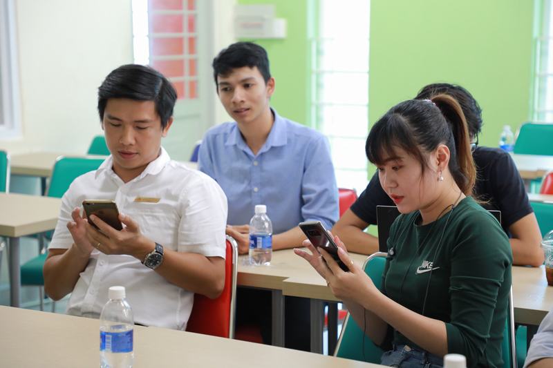 Các giảng viên hỗ trợ cuộc thi tìm hiểu cách vận hành mạng xã hội Azibai trên giao diện di động