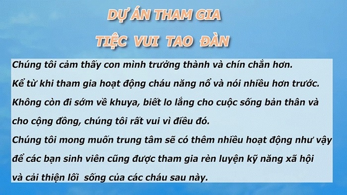 Ngoài thầy/cô và các đối tác, các bạn sinh viên khi tham gia dự án cũng nhận được sự ủng hộ lớn từ gia đình. Chương trình nhận được nhiều chia sẻ từ quý phụ huynh, cho thấy sự trưởng thành của các bạn khi đóng góp vào những hoạt động mang nhiều lợi ích cho cộng đồng.