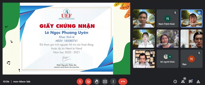 Và thời khắc quan trọng là lúc những bạn trẻ với trái tim nhiệt huyết được vinh danh, được công nhận cho những thành quả. Những tấm Giấy chứng nhận được trao cho những đóng góp của các bạn là minh chứng cho sự công nhận xứng đáng với những nỗ lực. Với những lời khen, lời động viên và khuyến khích từ thầy/cô và các anh chị đối tác cộng đồng, các bạn sinh viên UEF được tiếp thêm sức mạnh và tiếp tục tham gia vào các hoạt động cộng đồng trong năm học 2021 - 2022 này.
