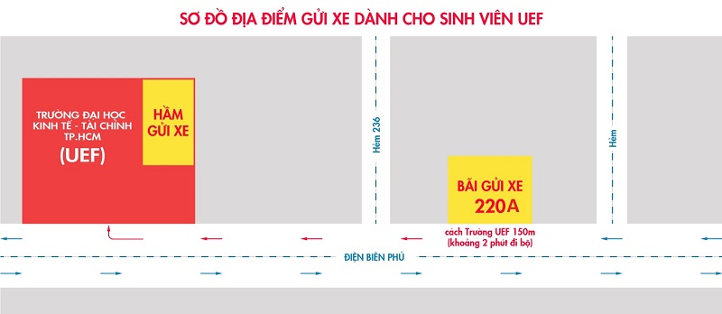 Nhằm bố trí thêm không gian gửi xe cho tân sinh viên khóa 2018 và sinh viên các khóa trước, ngoài địa điểm gửi xe tại trụ sở 276 Điện Biên Phủ, Phường 17, Quận Bình Thạnh, TP.HCM, Nhà trường đã bố trí thêm bãi giữ xe tại địa chỉ: 220A Điện Biên Phủ, Phường 17, Quận Bình Thạnh (cách trường khoảng 150m).