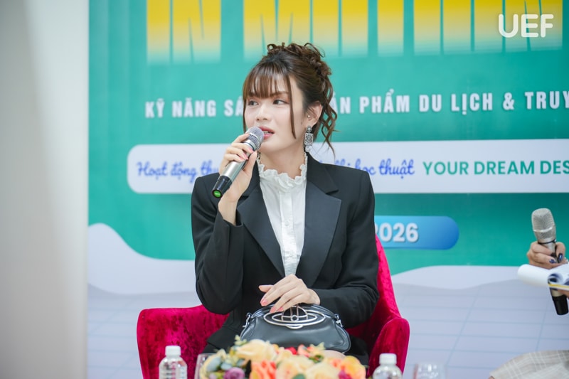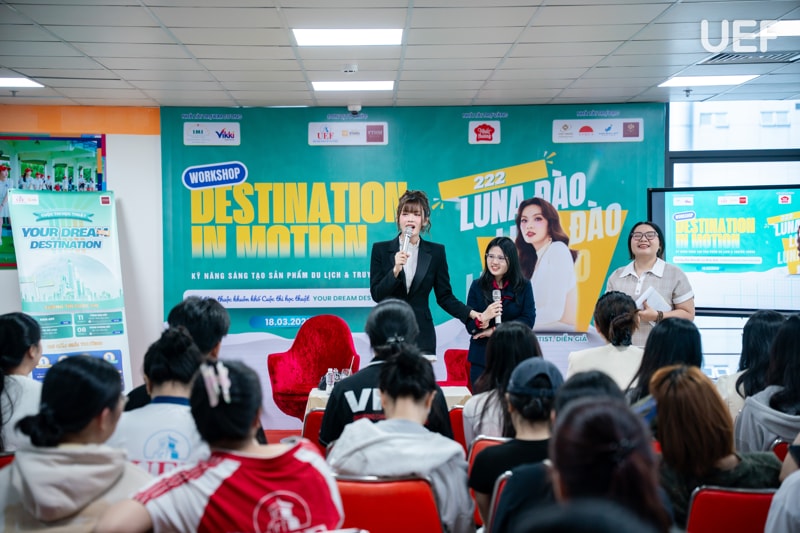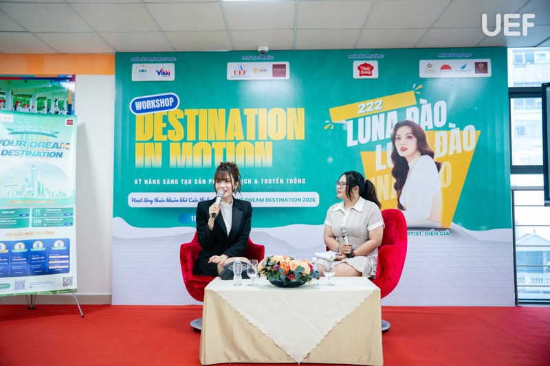 Trong khuôn khổ cuộc thi Your Dream Destination 2026, chiều ngày 18/03, Khoa Quản trị du lịch - Khách sạn UEF đã tổ chức workshop “Destination in Motion”, mang đến không gian trao đổi cởi mở, giàu cảm hứng về sáng tạo và truyền thông điểm đến. Chương trình có sự đồng hành của khách mời Luna Đào - nghệ sĩ trẻ, nhà sáng tạo nội dung được biết đến với góc nhìn hiện đại, độc lập và cá tính.