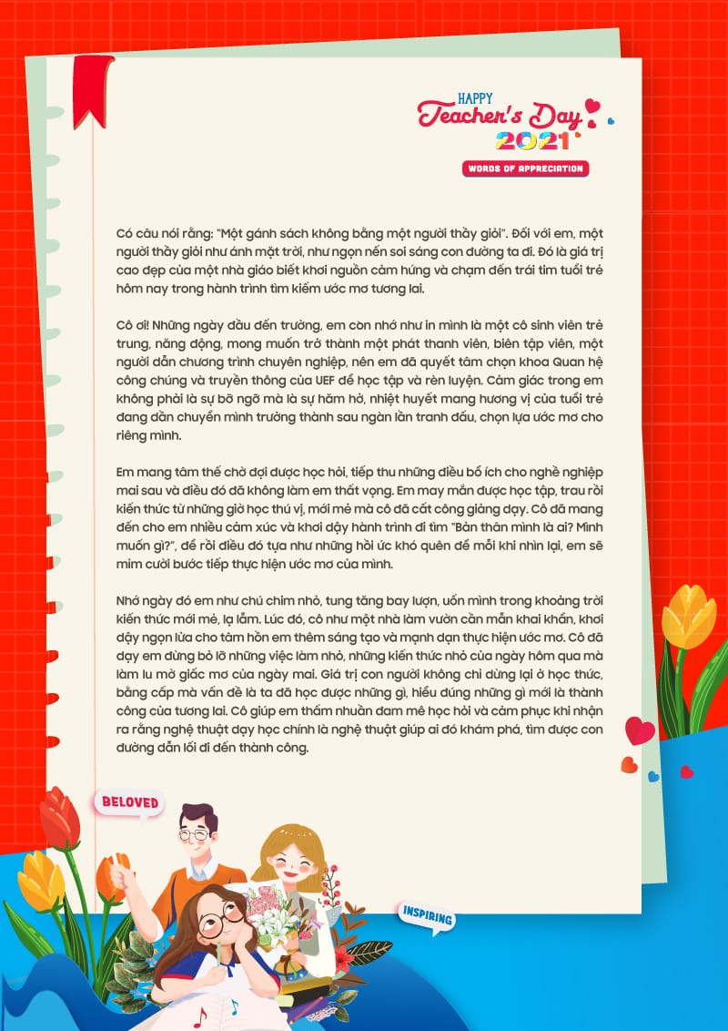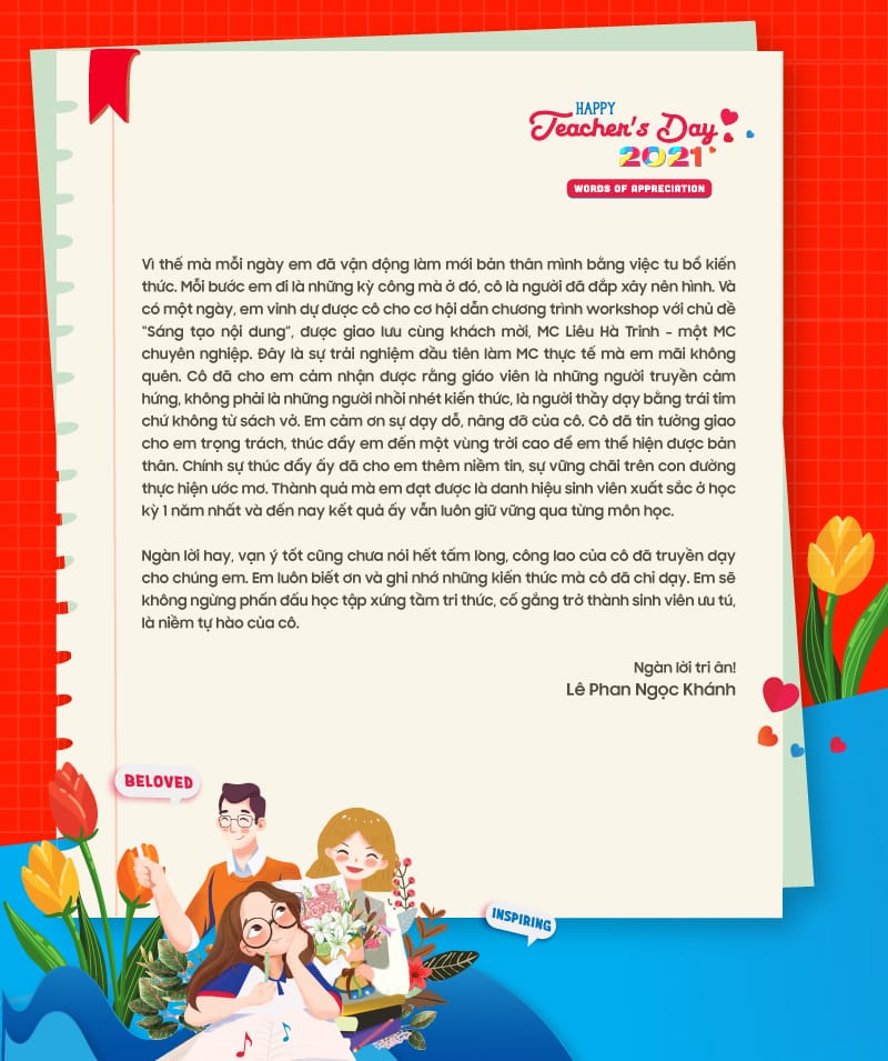 “Cô đã mang đến cho em nhiều cảm xúc và khơi dậy hành trình đi tìm “Bản thân mình là ai? Mình muốn gì?”, để rồi điều đó trở thành hồi ức khó quên mà mỗi khi nhìn lại, em sẽ mỉm cười bước tiếp trên hành trình thực hiện ước mơ của mình”.