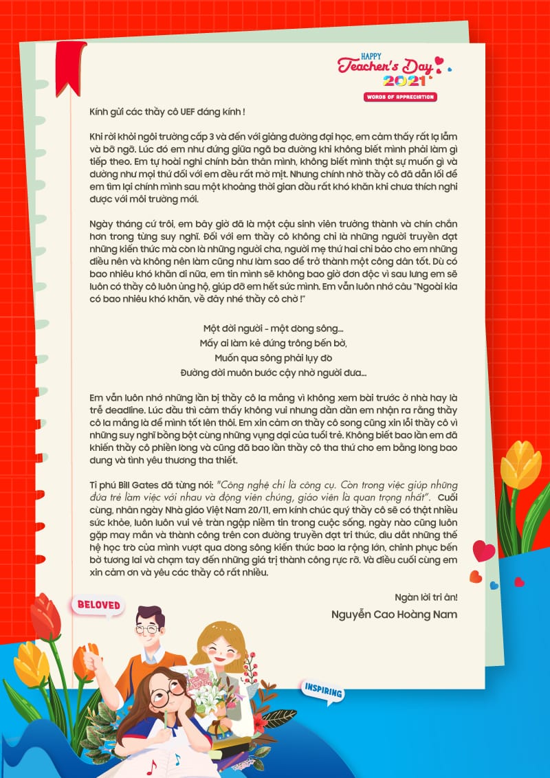 Cũng lớn lên từ những hoang mang của tuổi trẻ, nhân dịp “Tết nhà giáo”, bạn Nguyễn Cao Hoàng Nam, sinh viên khoa Quan hệ quốc tế cũng đã có những tâm tình gửi đến quý thầy, cô của mình.