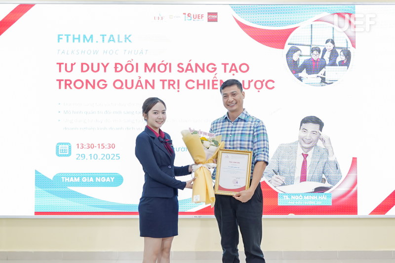 Chiều ngày 29/10, sinh viên Khoa Quản trị du lịch - Khách sạn (FTHM) đã có dịp tham gia buổi talkshow học thuật đầy cảm hứng với chủ đề “Tư duy đổi mới sáng tạo trong quản trị chiến lược”, do Khoa tổ chức cùng sự dẫn dắt của TS. Ngô Minh Hải - Phó Hiệu trưởng Nhà trường.