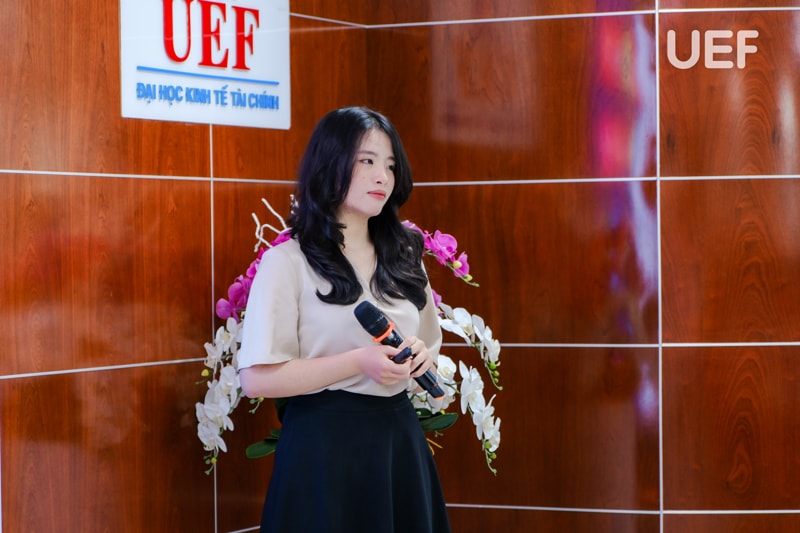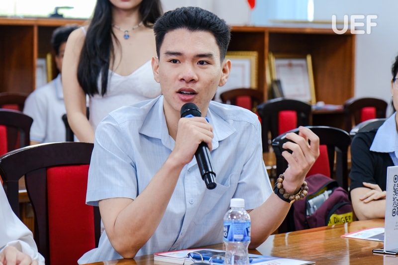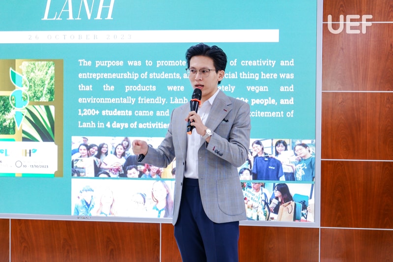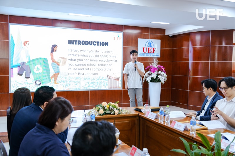Sinh viên Trương Quý Bảo với góc nhìn tập trung vào môi trường, đã dẫn dắt những người tham dự khám phá tầm quan trọng của việc tái chế và quản lý chất thải, lấy ý tưởng từ các khái niệm "từ chối, giảm thiểu, tái sử dụng và tái chế". UEFer nhấn mạnh vai trò của tái chế trong quản lý chất thải, bảo tồn nguyên liệu thô và lợi ích kinh tế, đặc biệt trong ngành thời trang. Chia sẻ kinh nghiệm cá nhân về việc tái chế quần áo cũ để hỗ trợ người vô gia cư đã mang lại cảm hứng mạnh mẽ cho người nghe.